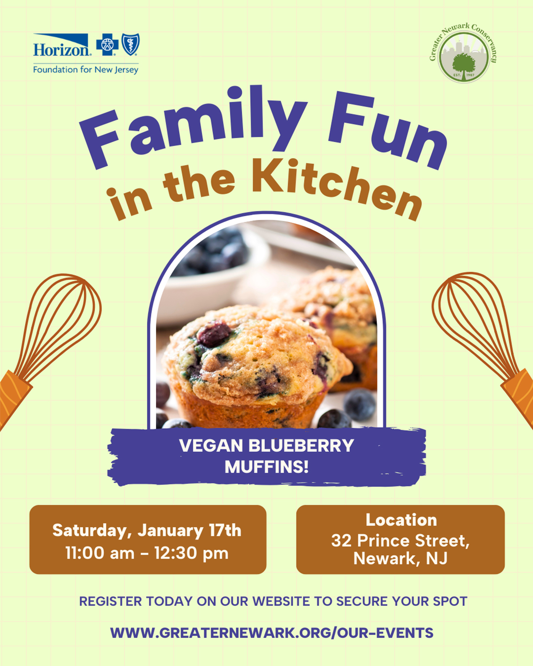 Start the new year with something sweet, simple, and family-friendly! Join us for January’s Family Fun in the Kitchen as Chef Afi leads a hands-on cooking experience featuring delicious Vegan Blueberry Muffins β€” a cozy winter treat packed with flavor and nutrition. Together, families will mix, measure, learn new kitchen skills, and enjoy warm muffins fresh out of the oven. It’s the perfect way to spend a winter morning while teaching little ones the joy of cooking and healthy eating.