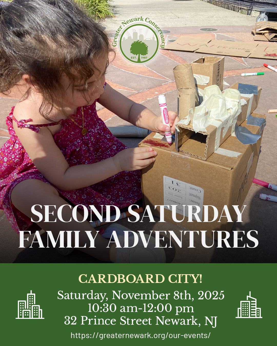 Join us for a morning of creativity and imagination at Greater Newark Conservancy! On Saturday, November 8th, from 10:30 AM to 12:00 PM, families will come together to design and build an entire city—entirely out of cardboard!